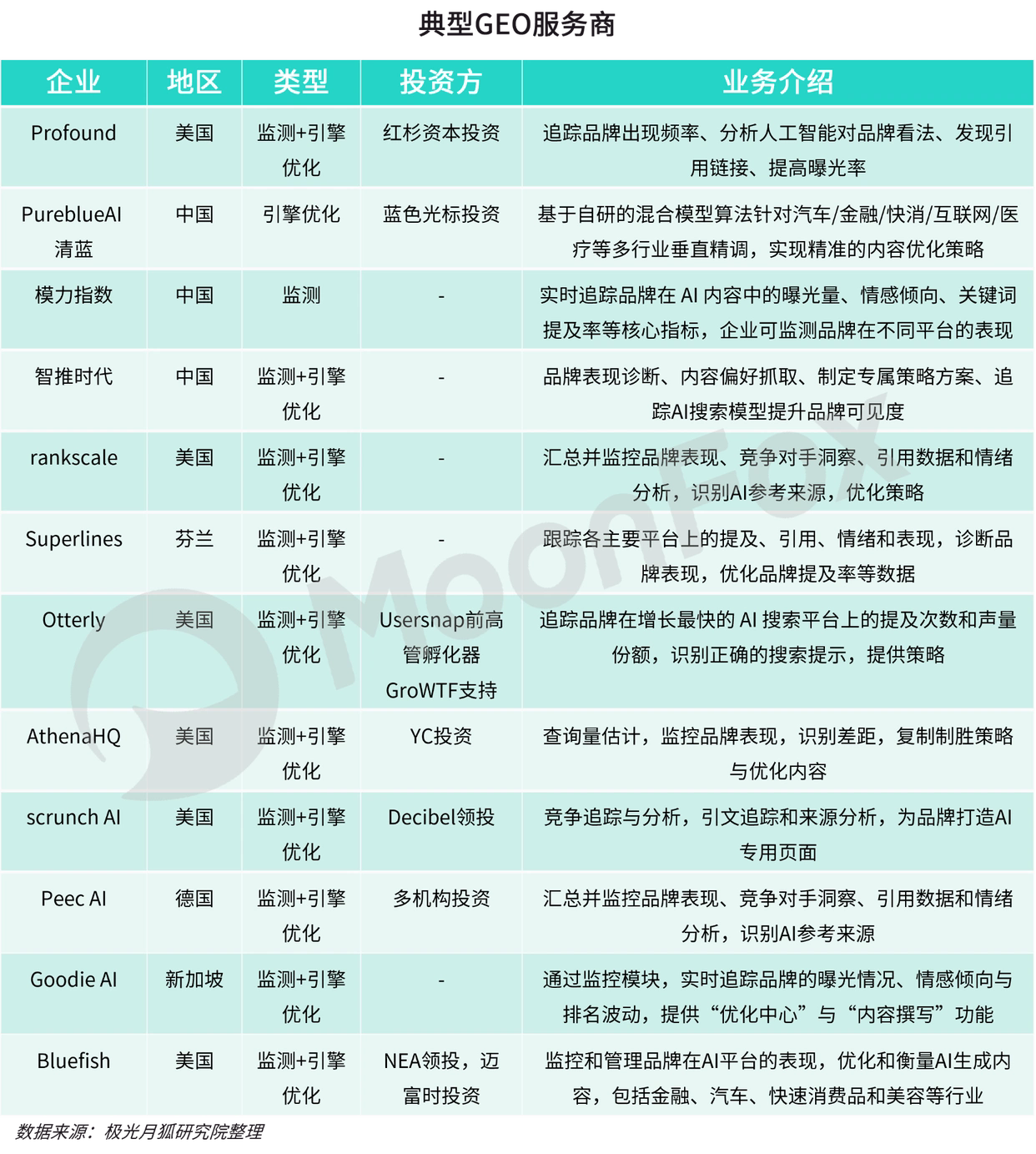 (1)GEO服务商多为2024年后成立的初创企业,其发展离不开SEO服务提供的沃土,背后多为顶级投资机构或头部AI营销企业扶持,或是由SEO服务经验深厚的团队组成。从地区情况来看,目前,美国GEO企业发展态势相对中欧较突出,企业多为24年后建立,如Profound、rankscale、Otterly、AthenaHQ、scrunchAI、Bluefish等。这些企业结合品牌数据追踪、表现诊断、AI平台引用情况分析及优化内容、网页结构等专属策略方案生成的全流程方案。中国的企业以PureblueAI 清蓝、模力指数较为突出,但从其官方资料资料看,模力指数专注于品牌监控与排名,清蓝专注于引擎优化。欧洲GEO领域仍在发芽阶段,以Superlines、Peec AI等企业为主。